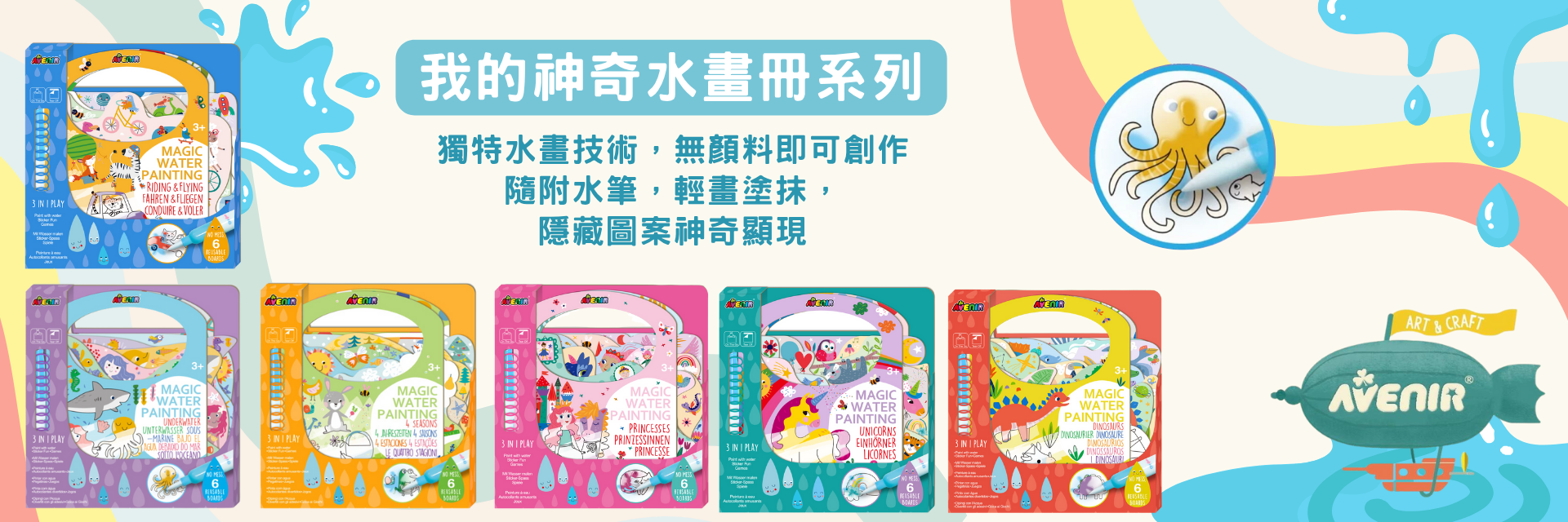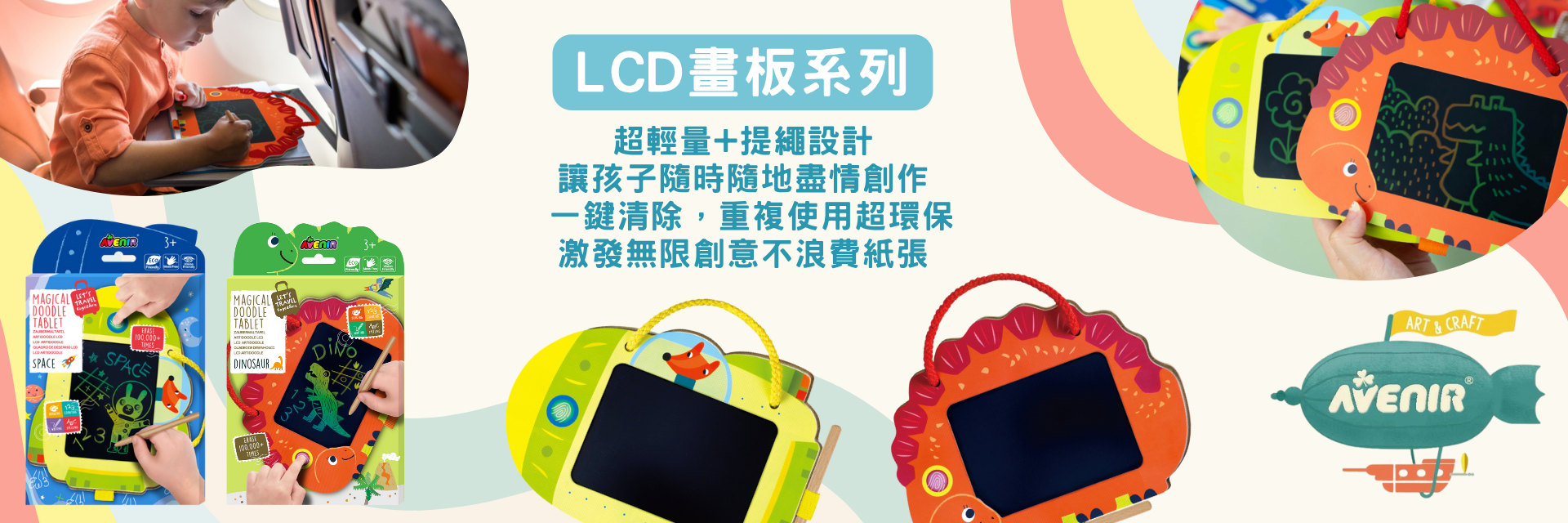 LCD畫板可重複書寫,一鍵清除,方便攜帶;水畫冊只需加水即可顯色,乾燥後可再次使用,是最適合外出與在家安靜活動的創作玩具。